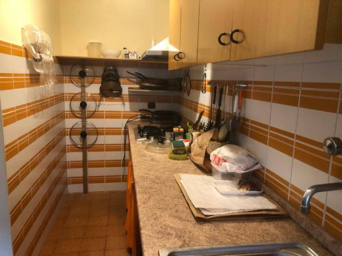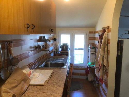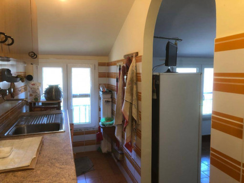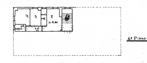 Appartamento di complessivi 70 mq circa, leggermente mansardato, sito al piano quarto ed ultimo senza ascensore, composto da ingresso su soggiorno con camino, cucinino semiabitabile, due camere da letto (di cui una matrimoniale ed una singola) ed un bagno con doccia. Comodo garage di 15 mq circa e fondaco di circa 4 mq entrambi al piano seminterrato.