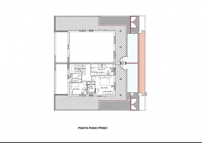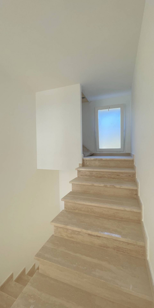 Il piano primo, di circa 70 m², collegato da una elegante scala interna in travertino, ospita tre camere da letto, di cui una matrimoniale con bagno en suite, due camere singole, un bagno principale e una terrazza panoramica con vista mare, oltre a balconi per una superficie complessiva di circa 55 m², veri e propri spazi da vivere all'aperto.