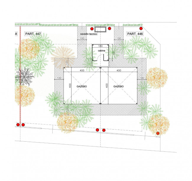 Sull'appezzamento di terreno in oggetto è possibile realizzare una cabina delle dimensioni di 1,80 x 1,80 metri oltre due gazebo ciascuno di 16 mq: totale superficie coperta sul lotto: 35,24 metri.