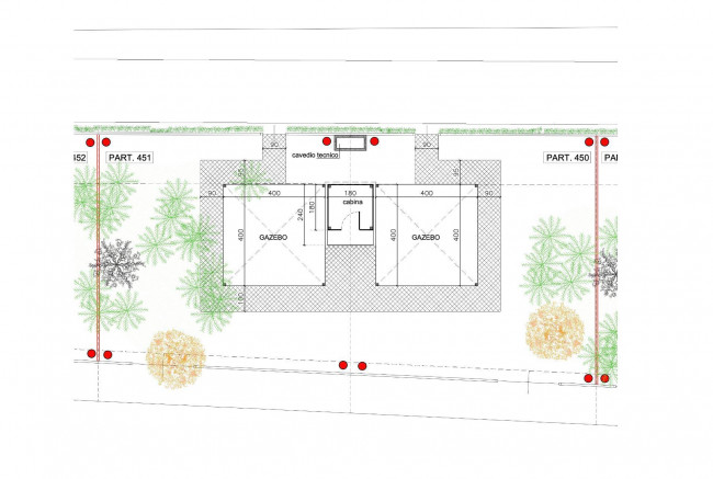 Sull'appezzamento di terreno in oggetto è possibile realizzare una cabina delle dimensioni di 1,80 x 1,80 metri oltre due gazebo ciascuno di 16 mq: totale superficie coperta sul lotto: 35,24 metri.