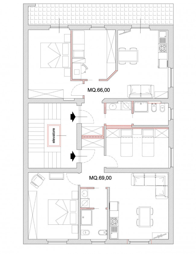 Finiture tipiche della sua epoca costruttiva (anni '60), consente di essere anche facilmente suddiviso in 2 distinte unità immobiliari, rispettivamente di 69 e 66 mq., ciascuna con soggiorno/angolo cottura, 2 camere da letto e bagno.
