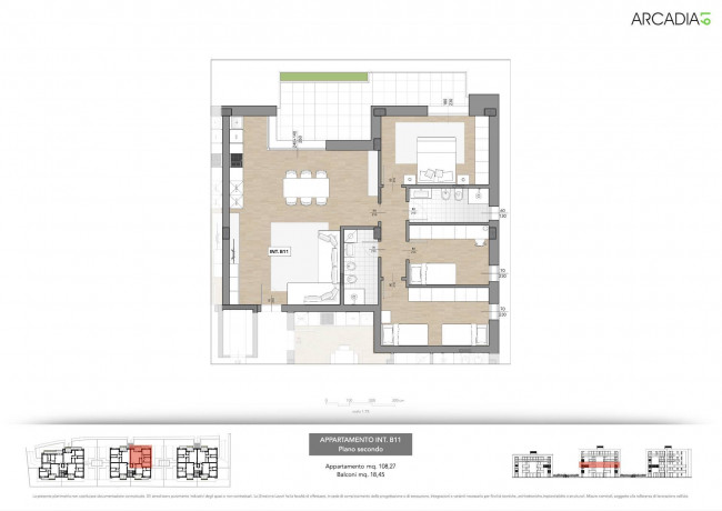 Appartamento al piano secondo con ascensore, delle dimensioni di 108 m² circa, composto da ingresso su ampio soggiorno con angolo cottura, tre camere da letto (una matrimoniale, una doppia ed una singola), due bagni di cui uno finestrato, disimpegno nel reparto notte. L'Appartamento è inoltre fornito di una terrazza abitabile di ben 18 mq circa, fruibile nella bella stagione per poterci soggiornare.
